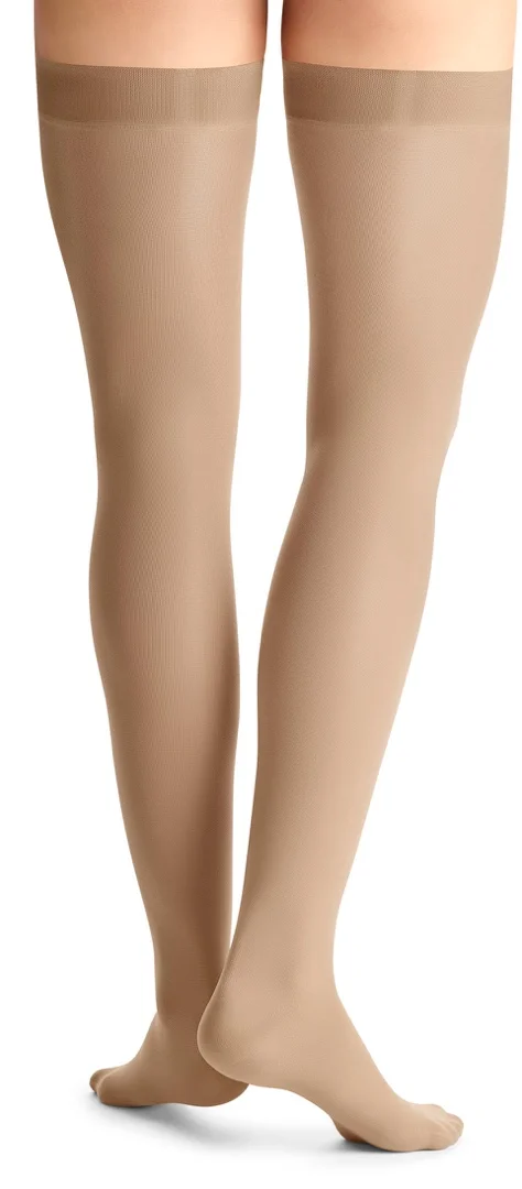 Neprůhledné kompresní stehenní punčochy JOBST Opaque se špicí pro osoby se žilními problémy.