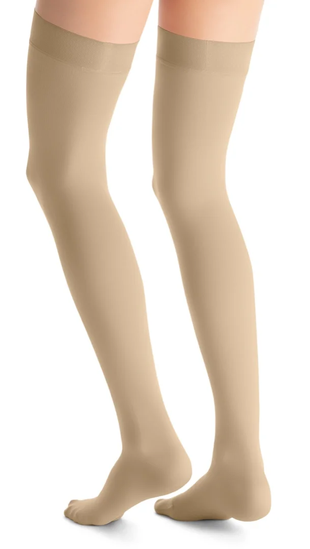 Neprůhledné kompresní stehenní punčochy JOBST Opaque se špicí pro osoby se žilními problémy.