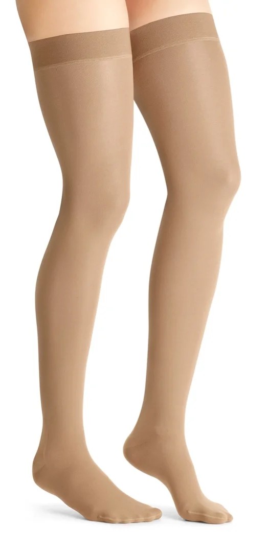 Neprůhledné kompresní stehenní punčochy JOBST Opaque se špicí pro osoby se žilními problémy.
