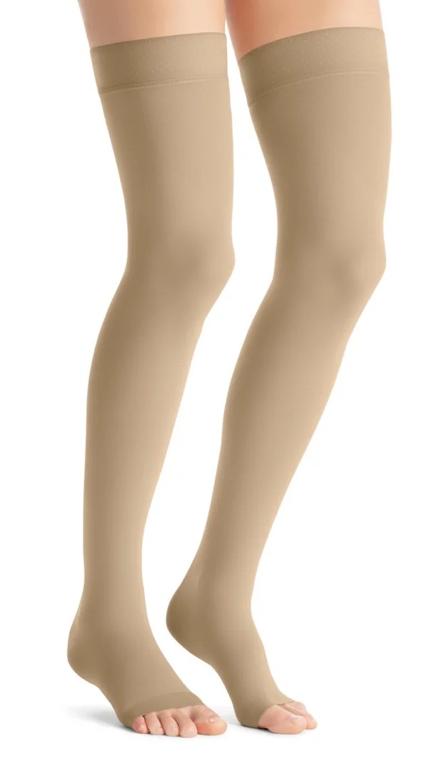 Průhledné prodyšné kompresní stehenní punčochy JOBST Ultra Sheer bez špice pro ženy se žilními problémy.