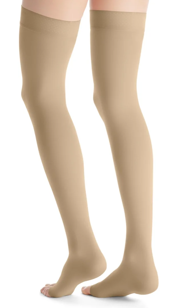 Průhledné prodyšné kompresní stehenní punčochy JOBST Ultra Sheer bez špice pro ženy se žilními problémy.