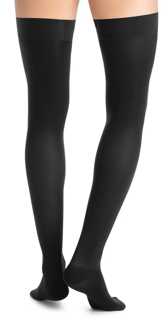 Průhledné prodyšné kompresní stehenní punčochy JOBST Ultra Sheer se špicí pro ženy se žilními problémy.