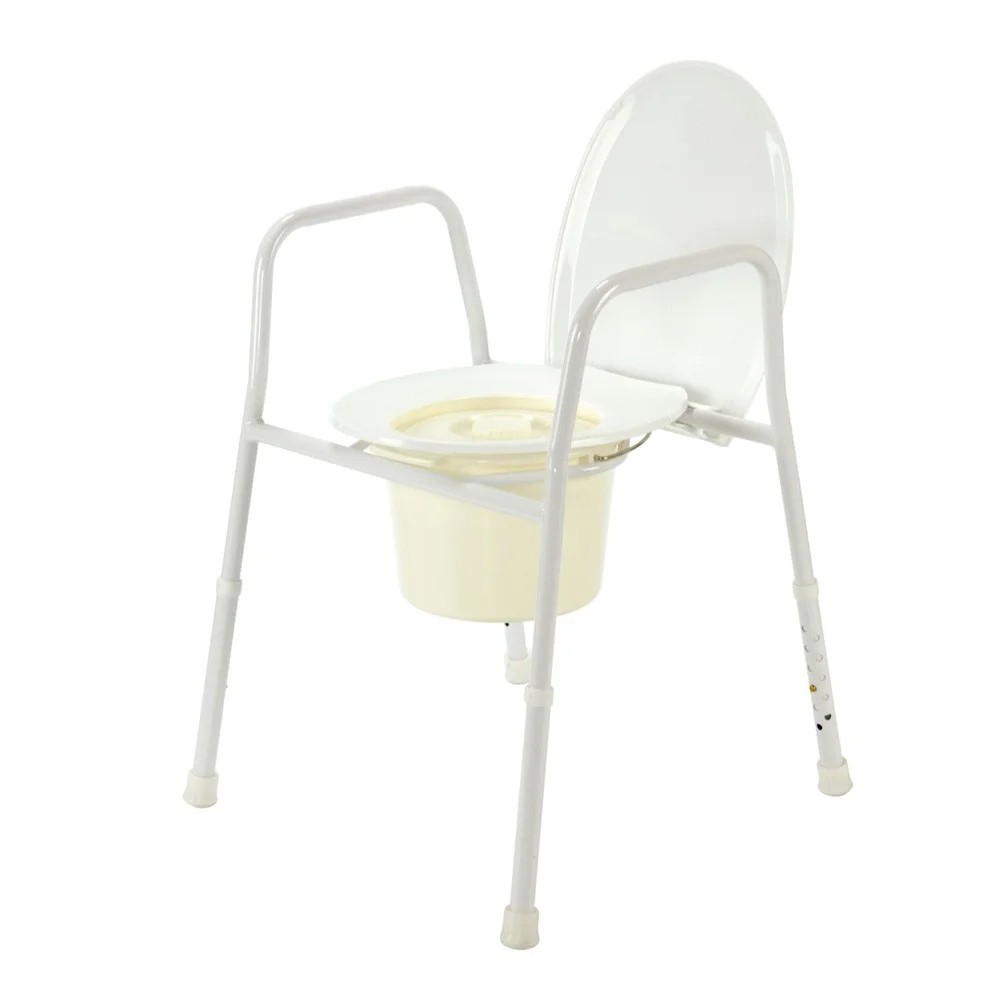 Rám křesla s bočními pevnými madly je doplněn omyvatelným plastovým toaletním sedátkem s víkem a plastovou toaletní nádobou. Výškově nastavitelné opěrné nohy jsou opatřeny protiskluzovými pryžovými nástavci.