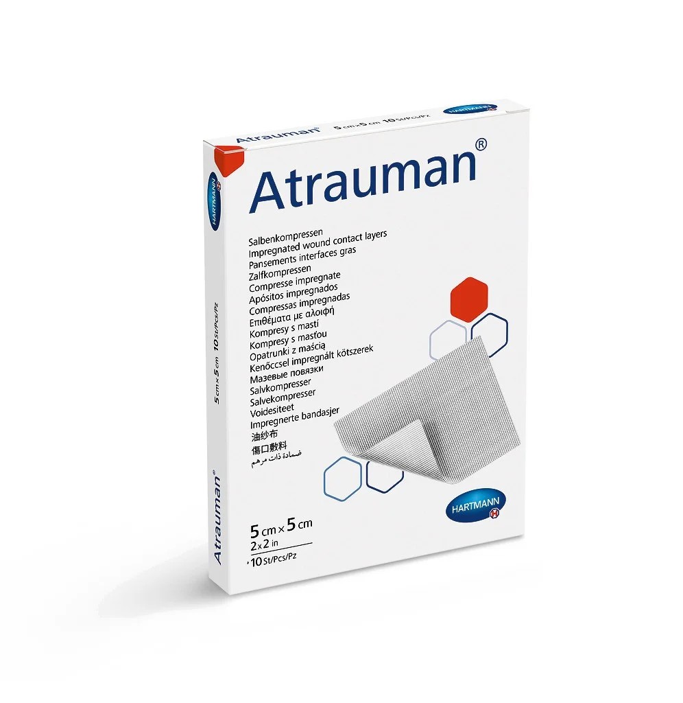Atrauman je sterilní hydrofobní kontaktní vrstva pro moderní hojení ran. Přípravek podporuje granulaci a znovuobnovení narušené tkáně, malá oka v jeho struktuře zabraňují prorůstání tkáně.