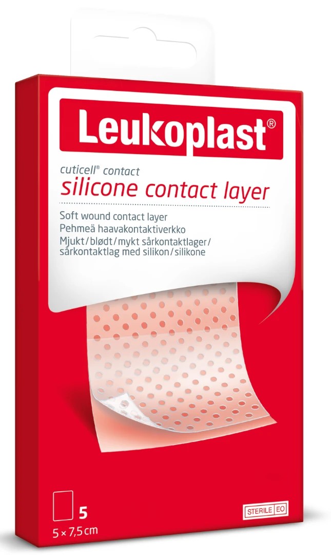 Sterilní silikonové krytí Leukoplast Cuticell contact je vhodné na akutní i chronické rány jako jsou drobné popáleniny, puchýře, odřeniny, na roztrženou nebo sedřenou kůži, proloženiny, vředy, po transplantaci kožních štěpů či po chirurgickém zákroku. Díky jemnému silikonovému povrchu je šetrné k pokožce a zabraňuje vrůstání absorpčního krytí do rány. Transparentní perforovaná mřížka propouští vzduch a sekret z rány. Aplikuje se přímo na ránu, následně se přiloží absorpční polštářek a celé se to zafixuje obvazem nebo fixační páskou. Lze ponechat na ráně i několik dní a vyměňovat pouze vrchní fixační vrstvu s polštářkem. Frekvence výměny závisí na stavu rány. Balení obsahuje 5 ks s rozměry = 5 cm x 7,5 cm. |