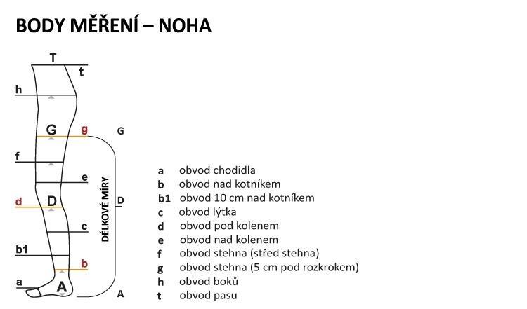 - Měření provádějte nejlépe po ránu, v průběhu dne končetiny natékají. Změřte všechny body, které vyžaduje tabulka velikostí daného výrobku. Umístění na končetině ilustrují obrázky. Při volbě velikosti jsou nejdůležitější hodnoty v bodech b (obvod nad kotníkem), d (obvod pod kolenem) a g (obvod 5 cm pod rozkrokem).