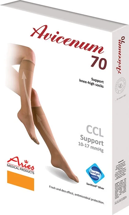 Punčochové zboží Avicenum PHLEBO 70 s podpůrnou zdravotní kompresí (10 – 17mmHg) jsou vyrobené z luxusní dvojitě ovíjené LYCRY®, která přispívá ke zvýšení komfortu při nošení a k delší životnosti výrobku. LYCRA® Soft Comfort zajišťuje perfektní elasticitu a kompresivní účinky těchto produktů. Punčochy jsou navíc zesílené v oblasti nejvyšší zátěže – v oblasti špice. Toto zesílení materiálu taktéž pomáhá k prodloužení životnosti výrobku. Lýtkové punčochy jsou opatřeny unikátní úpravou švýcarské firmy Sanitized ® s bakteriostatickým a deodoračním efektem, abyste se mohli cítit sebevědomě i po celodenním nošení. Tato úprava vydrží na produktech Avicenum po dobu až 120 pracích cyklů. Punčochy jsou bez obsahu latexu. Jsou vhodné pro běžné nošení i pro dlouhé a namáhavé cestování.Složení: