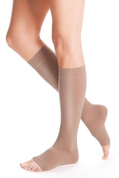 • vysoká elasticita nových materiálů tvořená vlákny Lycra® speciálně vyvinutými pro kompresivní výrobky usnadňuje oblékání punčoch a vytváří na končetině příjemný lesk