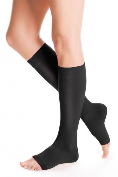 • vysoká elasticita nových materiálů tvořená vlákny Lycra® speciálně vyvinutými pro kompresivní výrobky usnadňuje oblékání punčoch a vytváří na končetině příjemný lesk