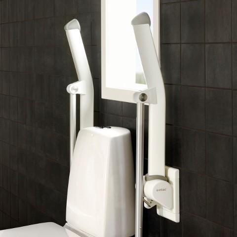 Sklopné madlo k toaletě určené pro montáž do zdi. Spolehlivá podpora a úspora místa.