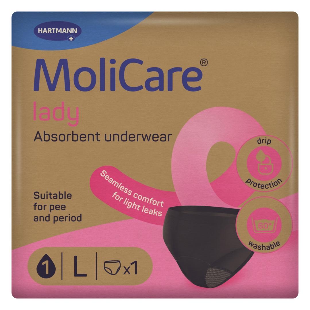 Díky designu na míru ženskému tělu je dámské absorpční prádlo MoliCare určeno pro ženy, které trpí lehkou inkontinencí a hledají neviditelné a udržitelné řešení. Navíc se hodí i jako menstruační kalhotky, protože pojmou tolik tekutiny jako 4 běžné menstruační tampóny.