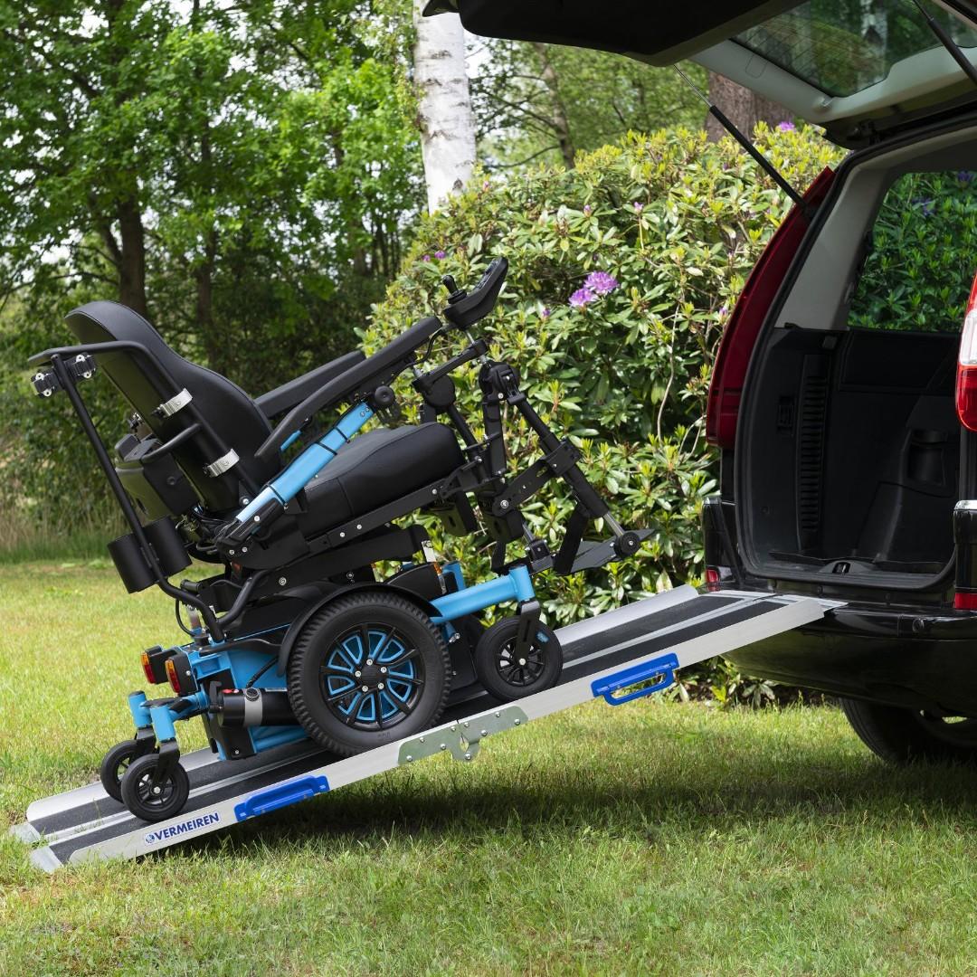 Rozkládací hliníková rampa usnadňuje vyvezení elektrických vozíků a skútrů do automobilů nebo do schodů.