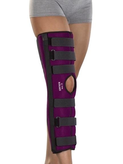 K rigidní fixaci kolenního kloubu v plné extenzi po poranění vazů kolena, po operacích v oblasti čéšky.