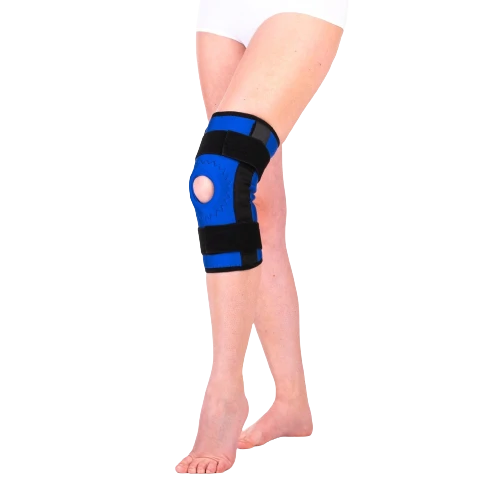 - ortéza má po stranách plastové dvouosé klouby, zajišťující dostatečnou podporu pohybu kolene