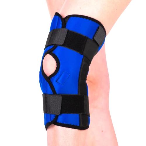 Kolenní ortéza vybavena po stranách plastovými dvouosými klouby, které zajišťují dostatečnou podporu pohybu kolene