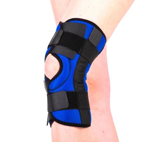 Kolenní ortéza vybavena po stranách plastovými dvouosými klouby, které zajišťují dostatečnou podporu pohybu kolene