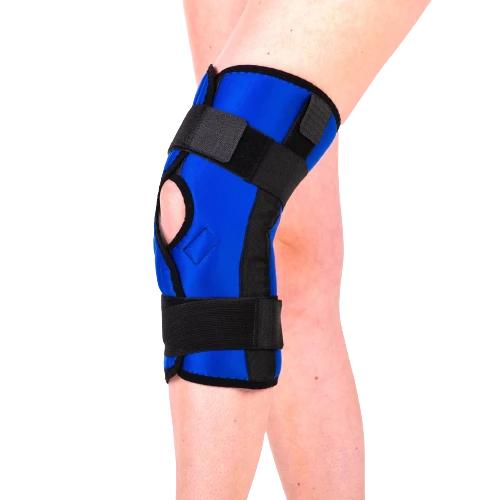 Dělená kolenní ortéza má po stranách kovové dvouosé klouby, zajišťující vysokou podporu pohybu kolene
