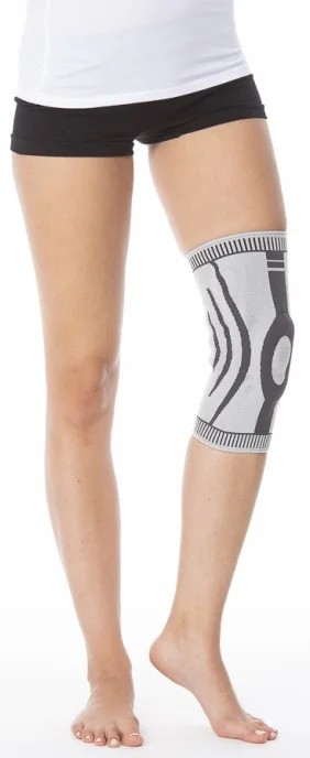 Ortéza na koleno se spirálovými bočními výztuhami a silikonovou výztuží pro čéšku vyrobená ze vzdušné textilie posiluje kloub, zajišťuje kompresi, stabilizaci a mírně ohřívá kolenní kloub.