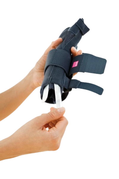 Bandáž Manumed T imobilizuje a stabilizuje zápěstí a palec díky dvěma tvarovatelným a odstranitelným hliníkovým dlahám.