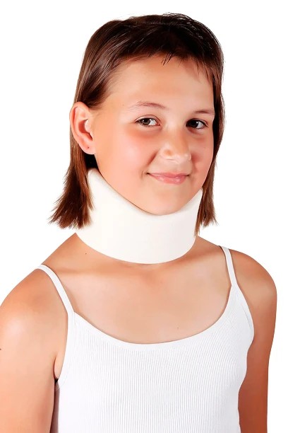 Anatomicky tvarovaný krční límec vyrobený z dostatečně tuhé pěnové hmoty, potažený bavlněným úpletem.