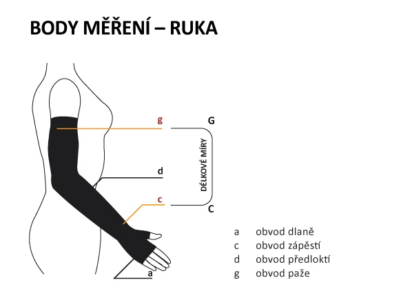 - Při volbě velikosti jsou nejdůležitější hodnoty v bodech c (obvod zápěstí) a g (obvod paže).