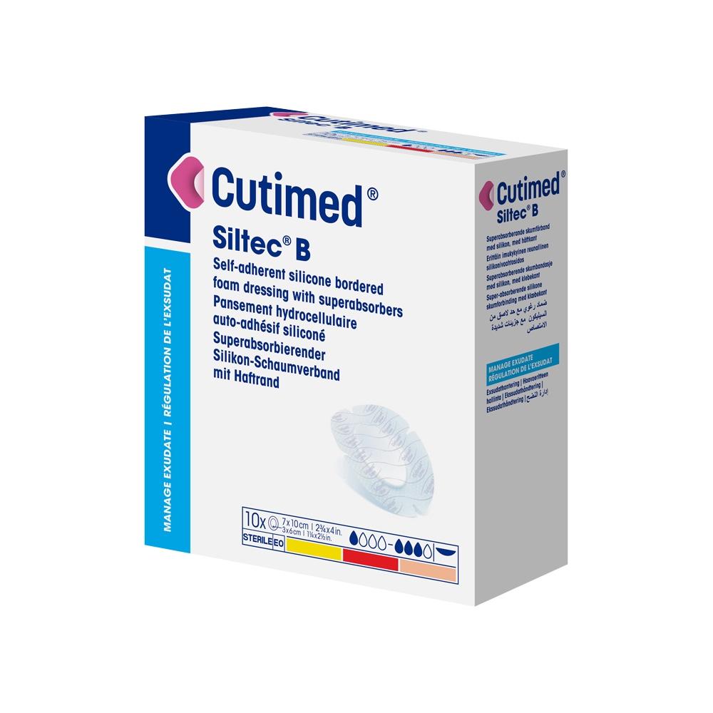Cutimed® Siltec® B je pěnové krytí potažené silikonovou vrstvou. Cutimed® Siltec® B je sterilní, absorpční krytí z polyuretanové pěny pro atraumatické převazy. Uvnitř krytí se nacházejí superabsorpční proužky, které absorbují a uzamykají exsudát. Kontaktní povrch krytí tvoří perforovaná silikonová vrstva, která umožňuje přilnutí ke kůži v okolí rány, ale ne k vlhké spodině rány nebo k nově vytvořené epiteliální tkáni. To minimalizuje trauma a bolest při převazech. Vnější vrstva je vodoodpudivá, přesto propustná pro kyslík a páry.