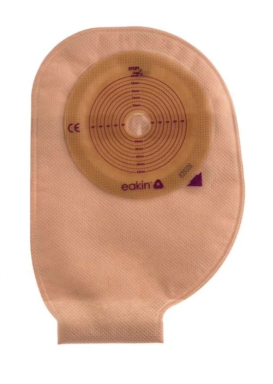 • Kromě toho je spodní strana výpustných sáčků zhotovena z prostřižené tkaniny. Přes průhledný film jde vidět na stomii, což umožňuje snadné a přesné připevnění sáčku. Prostřižená zadní část také umožňuje snadné nasazení krytu filtru. V ostatních případech hedvábně jemná tkanina diskrétně kryje stomii.