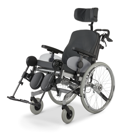 Součástí základní výbavy invalidního vozíku jsou polohovací stupačky s úhlově nastavitelnými podnožkami, bubnové brzdy pro doprovod, mělká hlavová opěrka a stabilizační kolečka.