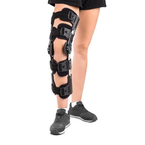 Pooperační kolenní ortéza s nastavitelným rozsahem pohybu v kolenním kloubu a délkově nastavitelnými dlahami.