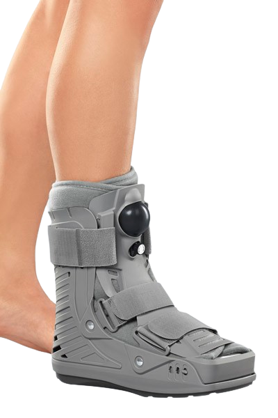 Krátká pooperační a rehabilitační nafukovací ortéza hlezna s protiskluzovou podrážkou a zapínáním na suchý zip.
