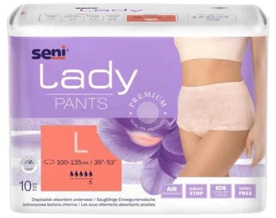 Hlavní výhodou Seni Lady Pants je to, že připomínají klasické spodní prádlo. Díky měkké vnější vrstvě absorpční kalhotky nešustí a jsou velmi diskrétní. Příjemný, měkký materiál (vnější vrstva vyrobena z prodyšného laminátu) zajišťuje pohodlí a ničím nerušený pohyb. Speciální vlastnost superabsorbentu Odour Stop zabraňuje vzniku nepříjemného zápachu. Neobsahují latex, což snižuje riziko vzniku alergických reakcí.
