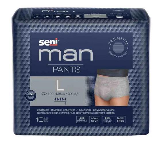 Hlavní výhodou Seni Man Pants je to, že připomínají klasické spodní prádlo. Díky měkké vnější vrstvě absorpční kalhotky nešustí a jsou velmi diskrétní. Příjemný, měkký materiál (vnější vrstva vyrobena z prodyšného laminátu) zajišťuje pohodlí a ničím nerušený pohyb. Speciální vlastnost superabsorbentu Odour Stop zabraňuje vzniku nepříjemného zápachu. Neobsahují latex, což snižuje riziko vzniku alergických reakcí.