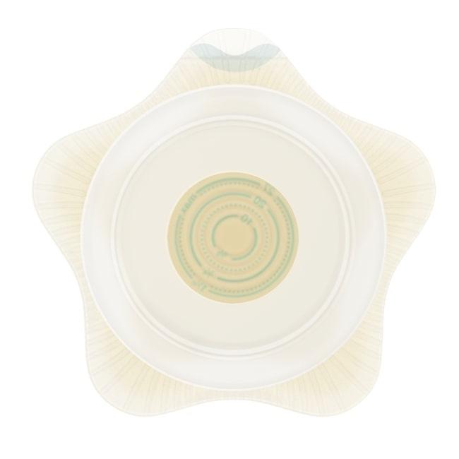Elastický lepicí materiál ve tvaru hvězdy, který je šetrný ke kůži, a speciální fit zóny (vroubkování) kolem okraje pomůcky zvyšují pružnost v okolí stomie a poskytují dětem volnost pohybu.