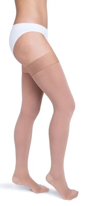 Stehenní punčochy první kompresní třídy (18 - 21 mmHg) se zavřenou špicí ukončené krajkou se silikonovými proužky.