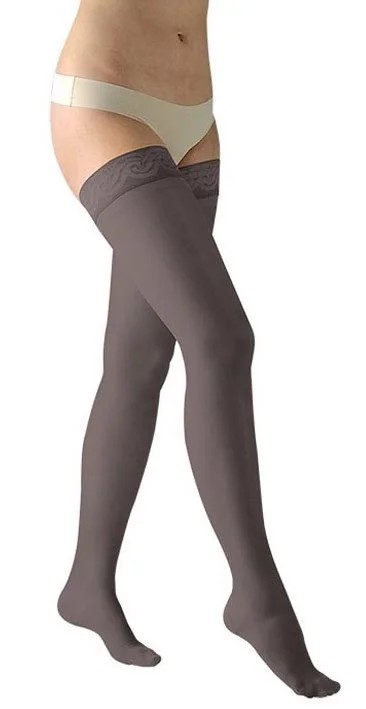Odlehčené stehenní punčochy druhé kompresní třídy (23 - 32 mmHg) se zavřenou špicí, ukončené krajkou se silikonovými proužky.