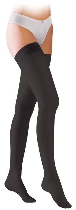 Odlehčené stahovací stehenní punčochy druhé kompresní třídy (23 - 32 mmHg) se zavřenou špicí, zakončené krajkou se silikonovými proužky.