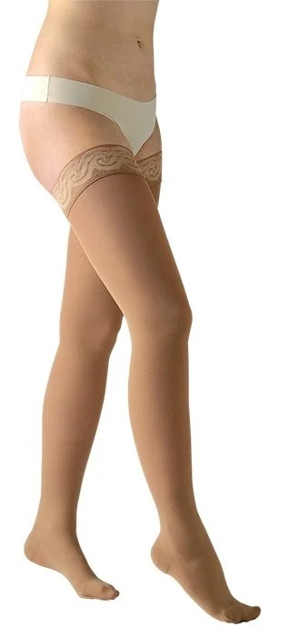 Stehenní stahovací punčochy druhé kompresní třídy (23 - 32 mmHg) se zavřenou špicí, zakončené krajkou se silikonovými proužky.