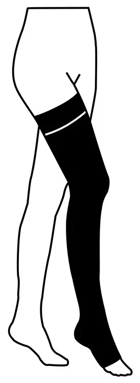 Stehenní punčochy druhé kompresní třídy (23 - 32 mmHg) s otevřenou špicí ukončené lemem se silikonovými nopky.