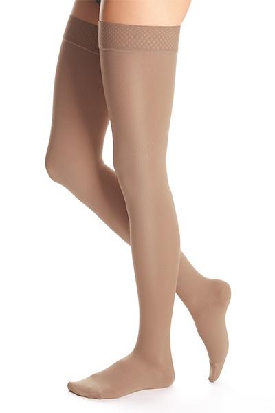 • vysoká elasticita nových materiálů tvořená vlákny Lycra® speciálně vyvinutými pro kompresivní výrobky usnadňuje oblékání punčoch a vytváří na končetině příjemný lesk