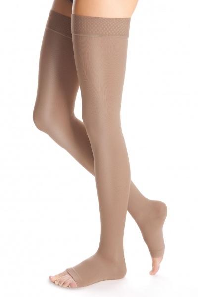 • vysoká elasticita nových materiálů tvořená vlákny Lycra® speciálně vyvinutými pro kompresivní výrobky usnadňuje oblékání punčoch a vytváří na končetině příjemný lesk
