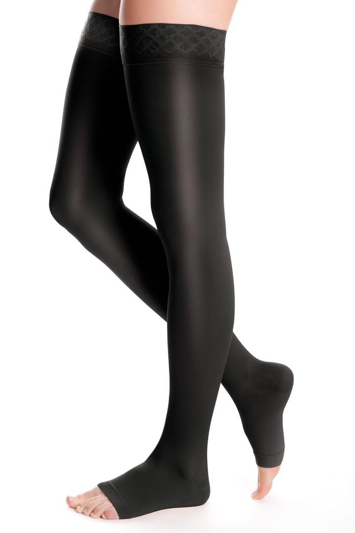 • vysoká elasticita nových materiálů tvořená vlákny Lycra® speciálně vyvinutými pro kompresivní výrobky usnadňuje oblékání punčoch a vytváří na končetině příjemný lesk