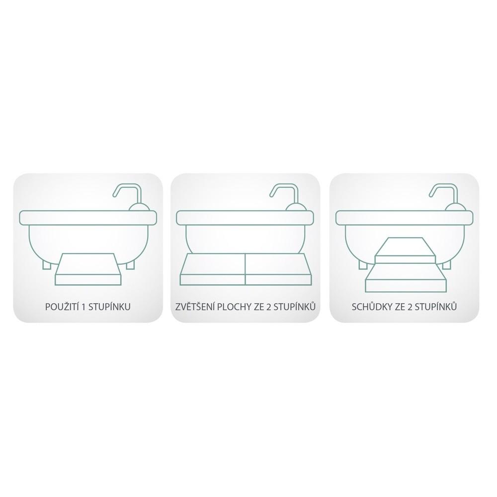 Pohodlné řešení vnější dorovnání výšky dna vany, které ulehčuje bezpečný přesun do/z vany. Součástí balení jsou dva 2 cm zvyšovací díly, kterými lze docílit požadovanou výšku 5, 7 nebo 9 cm. V případě potřeby je možné dokoupit až 8 dalších dílů Prima Step 61920 a zvednout stupínek až na 30 cm. Více stupínků lze mezi sebou vzájemně nakombinovat a spojit pro zvětšení plochy nebo jako schůdky.