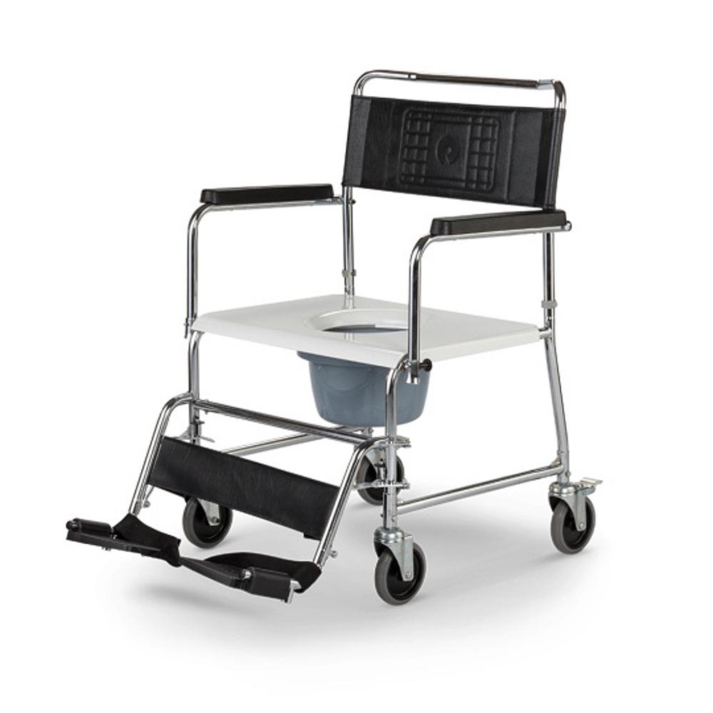 Pojízdné toaletní křeslo v nadměrné velikosti, které po vyjmutí toaletní nádoby lze použít i nad pevnou mísou WC.