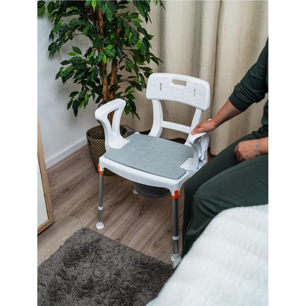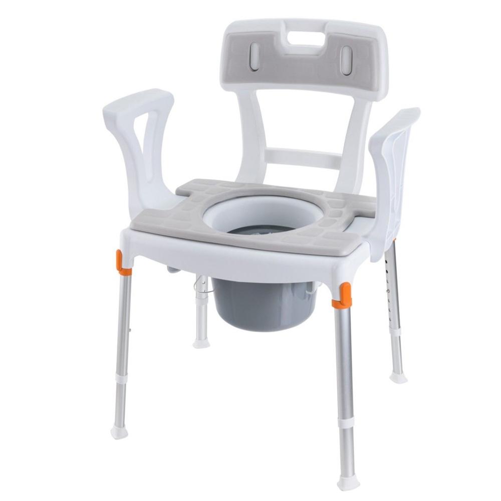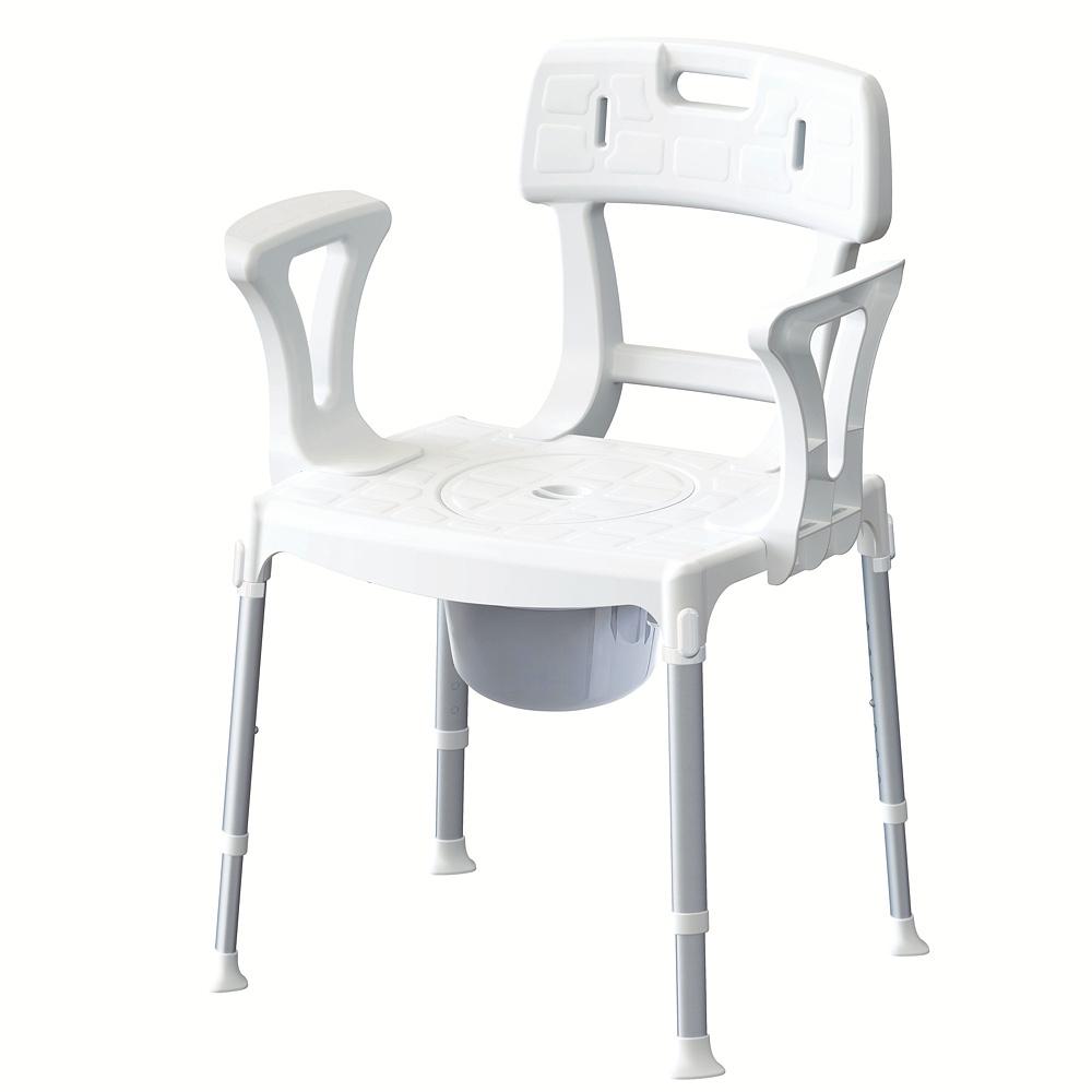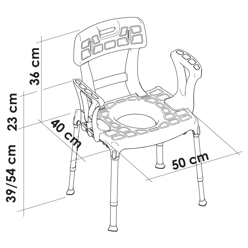 Židli lze jednoduše složit a rozložit bez použití nářádí a je tak vhodná i při přesunech z místa na místo. Díky modulárnímu systému je navíc možné použít jen samotnou sedačku a dle potřeby ji případně doplnit jednou nebo oběma područkami a opěrkou zad. Bez problémů si ji tak přizpůsobíte svým individuálním potřebám. Navíc ji lze použít také ke sprchování, po vyjmutí nádoby jako nástavec na WC nebo po doplnění polstrováním jako odpočinkovou židli.