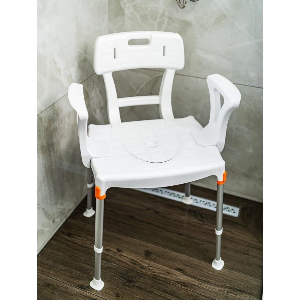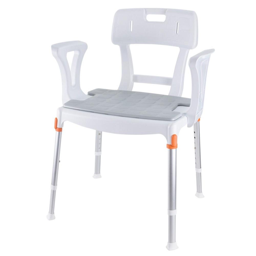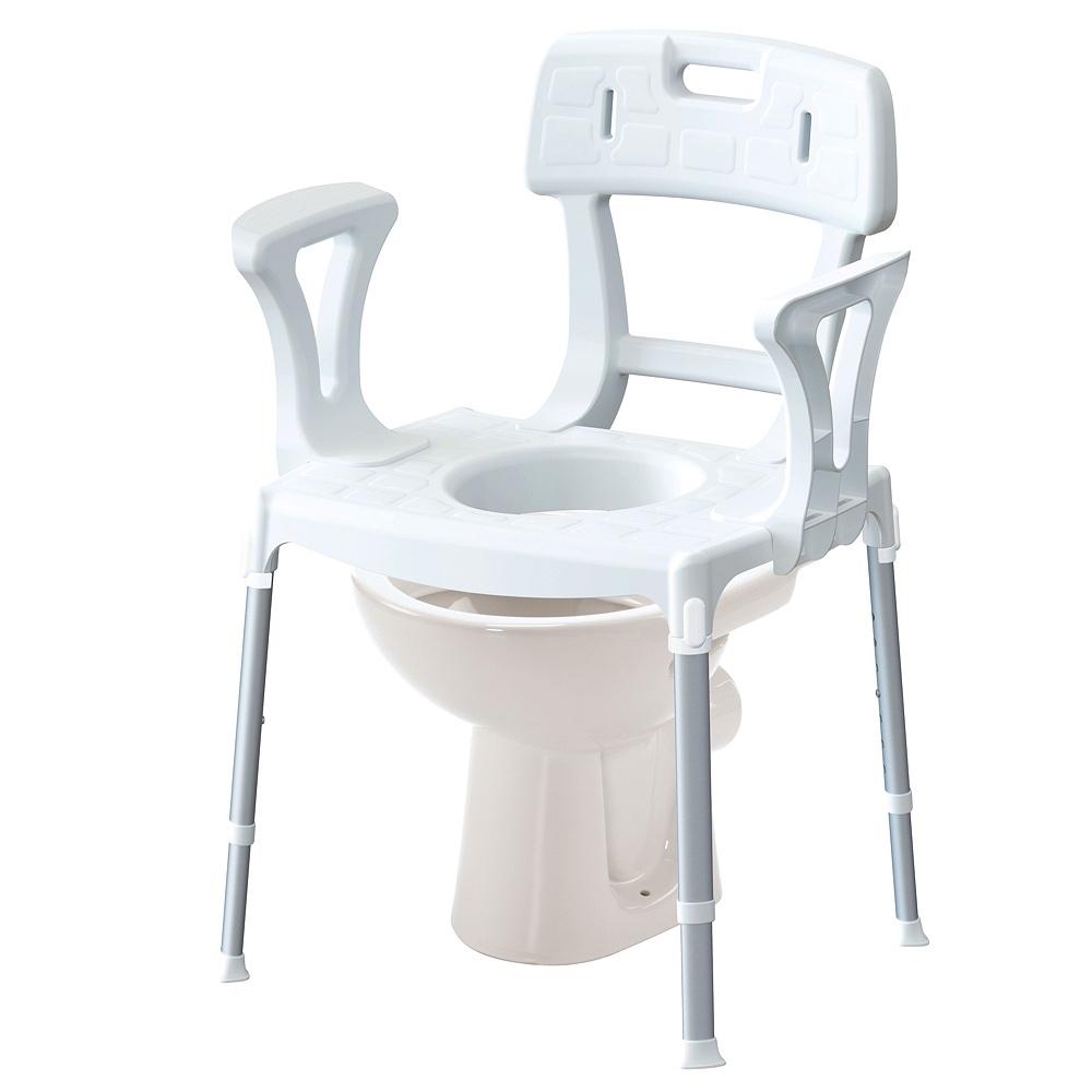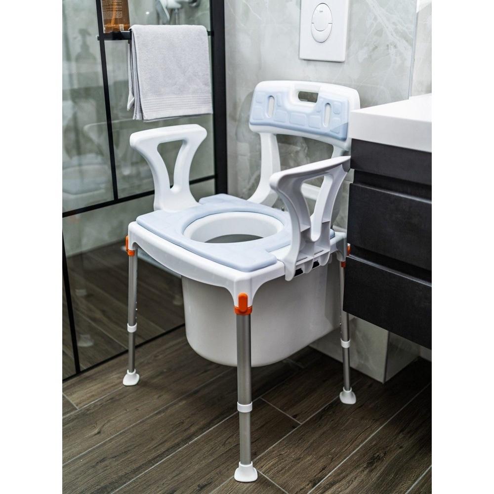 Židli lze jednoduše složit a rozložit bez použití nářádí a je tak vhodná i při přesunech z místa na místo. Díky modulárnímu systému je navíc možné použít jen samotnou sedačku a dle potřeby ji případně doplnit jednou nebo oběma područkami a opěrkou zad. Bez problémů si ji tak přizpůsobíte svým individuálním potřebám. Navíc ji lze použít také ke sprchování, po vyjmutí nádoby jako nástavec na WC nebo po doplnění polstrováním jako odpočinkovou židli.