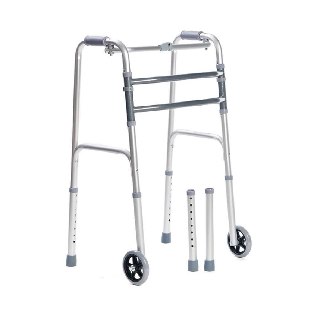 Trojfunkční skládací chodítko, které může být použito jako pevné, kloubové nebo dvoukolové chodítko.