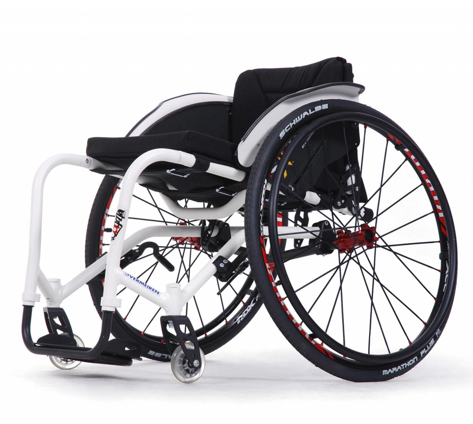 - Do základní výbavy náleží sedák a zádová opěrka typu CORDURA a možnost změnit těžiště vozíku a různých úhlů zadních kol: 0° - 2° - 4° - 6° - 8° - 10°. šířka sedu 36 - 46 cm