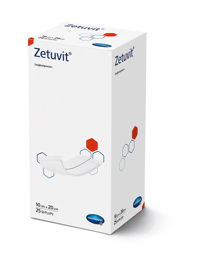 Kompres Zetuvit je vyroben z vysoce bělené buničiny s vysokou savou schopností. Savé jádro vyrobené z vloček buničiny účinně odvádí sekret z rány. Vrstva na vnější straně kompresu je hydrofobní a zároveň prodyšná