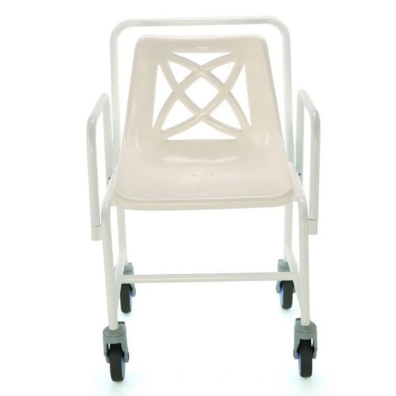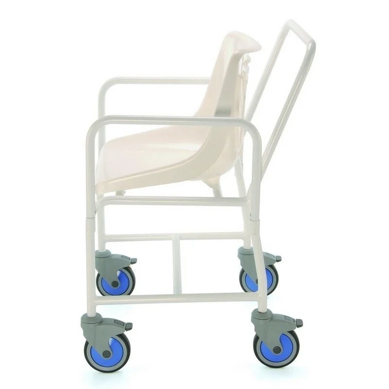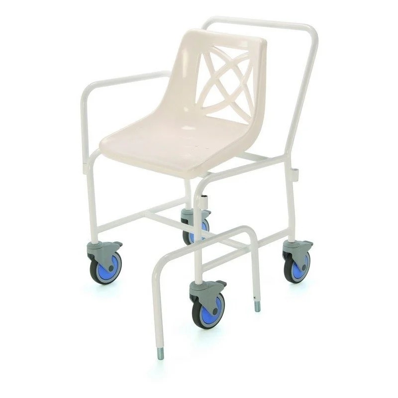Plastové potažené ocelové sprchové křeslo s mušlovým sedákem, které umožňuje uživateli sedět pohodlně při sprchování. Gumové kroužky na nohách sníží klouzání a nezanechávají skvrny na podlaze sprchy.