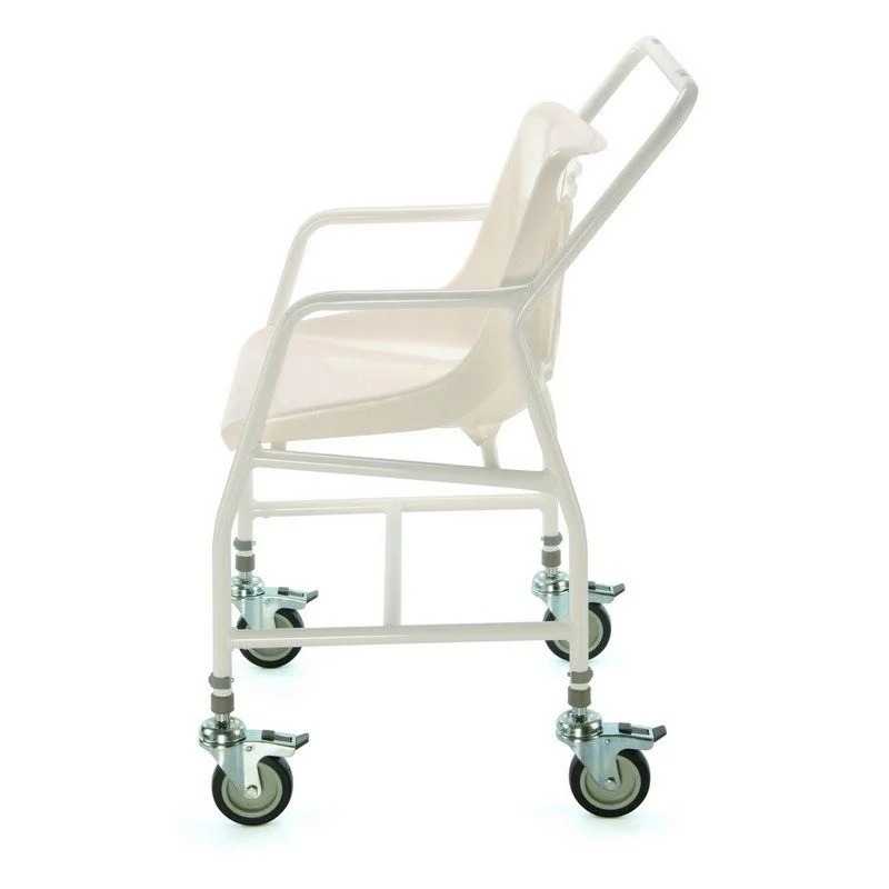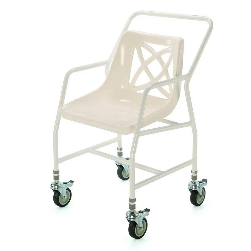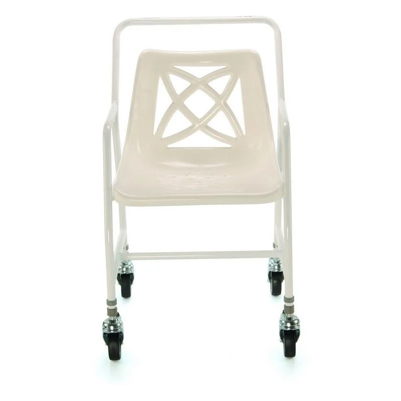 Plastové potažené ocelové sprchové křeslo s mušlovým sedákem, které umožňuje uživateli sedět pohodlně při sprchování.